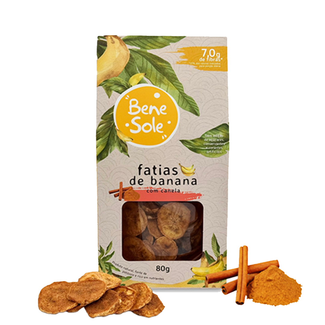 As fatias de banana com canela são um Snack nutritivo e cheio de aroma, com 7g de fibras, que equivalente a 27% da ingestão diária recomendada. Fonte de potássio e ricas em nutrientes, ajudam a manter sua energia ao longo do dia. Sem adição de açúcares, conservantes ou corantes artificiais, são ideais para um lanche leve, natural e saboroso.