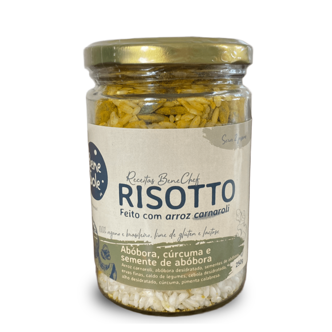O Risoto de Abóbora, Cúrcuma e Semente de Abóbora Benesole une arroz carnaroli, abóbora desidratada, sementes de abóbora, ervas finas, caldo de legumes, cebola desidratada, alho desidratado, cúrcuma e um toque de pimenta calabresa.