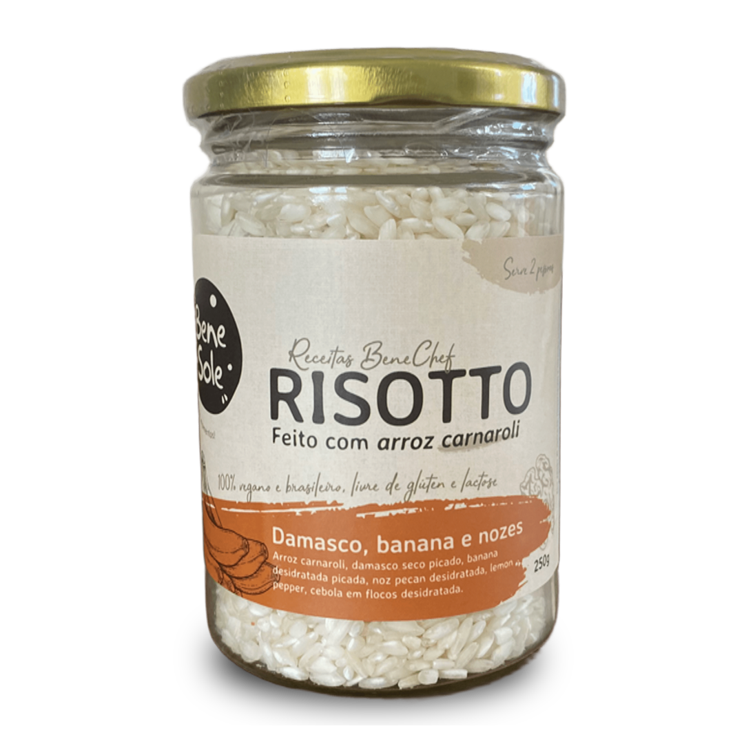 O Risotto de Damasco, Banana e Nozes Benesole traz arroz carnaroli, damasco seco picado, banana desidratada picada, noz pecan desidratada, lemon pepper e cebola em flocos desidratada.